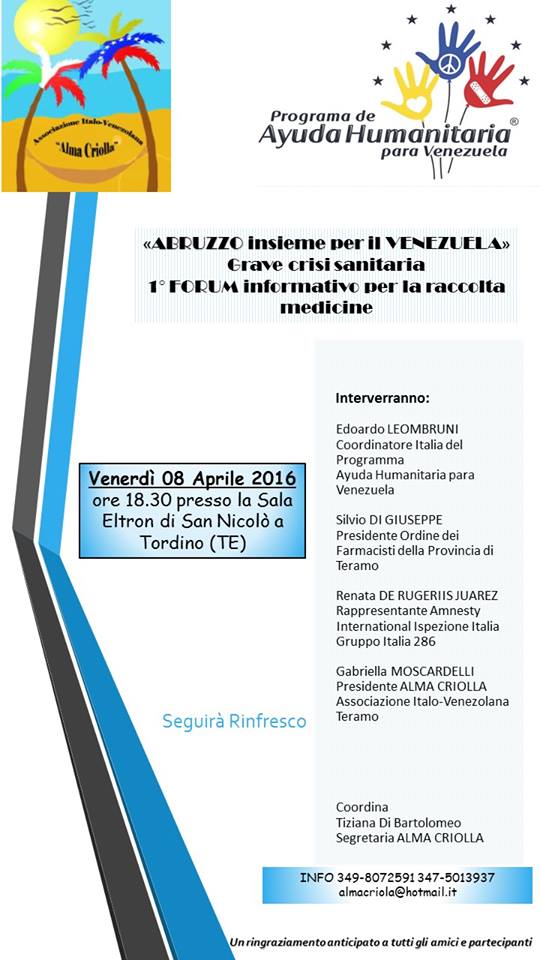 La nostra Associazione Alma Criolla – spiegano gli organizzatori – per quanto illustrato, organizza il 1° Forum Informativo, per la raccolta medicine, il giorno venerdì 8 aprile alle 18.30 nella sala Eltron di San Nicolò a Tordino. All’incontro interverranno: Eduardo Leombruni (Coordinatore Italia del Programma Ayuda Humanitaria para Venezuela), Silvio Di Giuseppe (Presidente Ordine dei Farmacisti della Provincia di Teramo), Renata De Rugeriis Juárez (Rappresentante Amnesty International) e Gabriella Moscardelli (Presidente Ass.ne Alma Criolla-Te). Aiutiamo oggi il Venezuela, terra che nel passato accolse tanti italiani senza chiedere nulla in cambio e oggi con un piccolo contributo possiamo salvare tante vite. Vi aspettiamo! / Los esperamos!”
