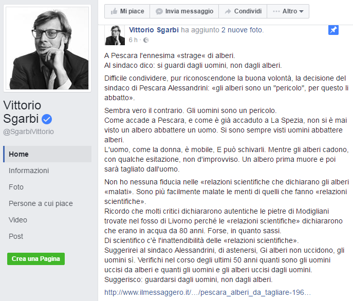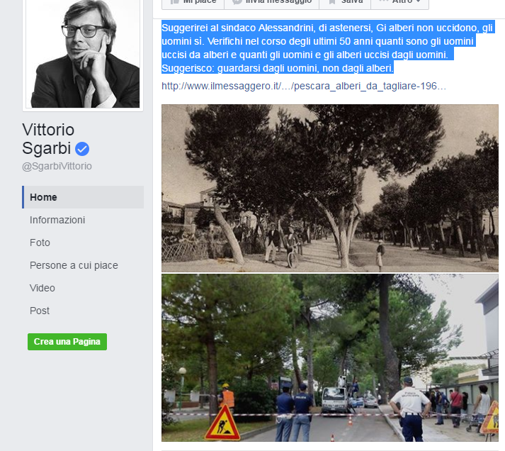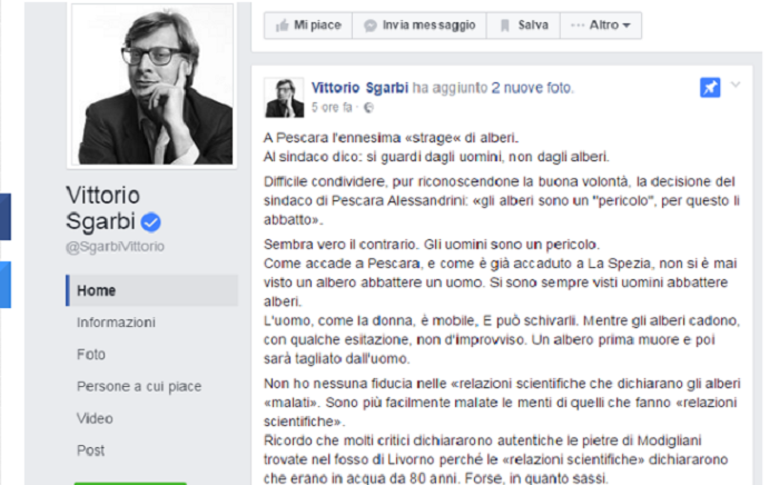 Il post di Vittorio Sgarbi sulla vicenda alberi a Pescara, non è di certo passato inosservato, tanto che è stato ripreso anche dalla stampa nazionale. Con la veemenza dialettica a cui Sgarbi ci ha abituati, si rivolge direttamente al sindaco Alessandrini per fermare quella che definisce “l’ennesima strage di alberi”. L’intervento di Sgarbi segue di pochi giorni quello di Erri De Luca e di Alessandro Gassmann a sostegno delle ragioni di ambientalisti e cittadini.