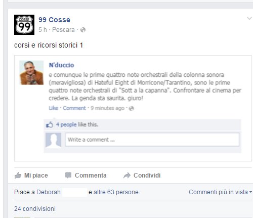 “E comunque le prime quattro note orchestrali della colonna sonora (meravigliosa) di Hateful Eight di Morricone/Tarantino, sono le prime quattro note orchestrali di ‘Sott a la capanne’. Confrontare al cinema per credere. La genda sta esaurita. Giuro!”