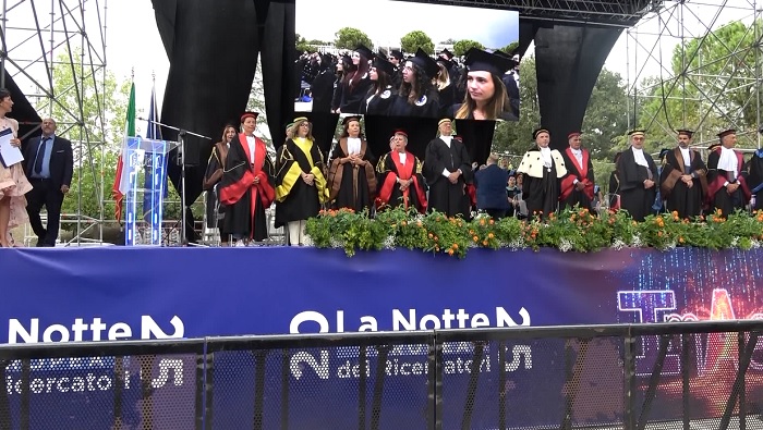 La pioggia non ha rovinato il grande evento organizzato, ieri, dal Gruppo di lavoro coordinato dalla professoressa Elisabetta Dimauro che è anche la Responsabile delle manifestazioni che si svolgono in Ateneo. La pioggia non ha rovinato la giornata. Si sono svolti il sia Graduation Day-Festa dei neolaureati dell’Ateneo sia la Cerimonia di conferimento dell’Ordine della Minerva, la più alta onorificenza concessa dall’Università degli Studi “Gabriele d’Annunzio” di Chieti-Pescara. Tutto concentrato nel pomeriggio, a partire dalle ore 15.00 con l’avvio del Graduation Day che ha innestato senza soluzione di continuità con la Cerimonia che ha visto insigniti dell’Ordine della Minerva la professoressa Gigliola Staffilani, Full Professor Department of Mathematics – Massachusetts Institute of Technology (MIT) e al professor Remo Ruffini, docente di Fisica Teorica e Direttore dell’ICRANet (International Centre for Relativistic Astrophysics Network). I neolaureati hanno potuto quindi ascoltare le lectio magistralis dei due insigni scienziati, che saranno per loro autorevoli discorsi motivazionali.