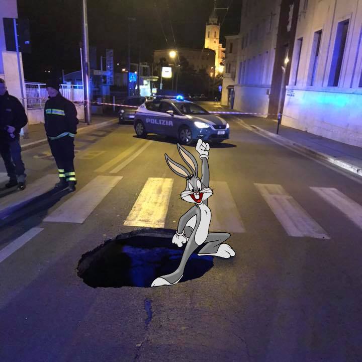 Si cerca di sdrammatizzare con divertenti fotomontaggi “postati” sul Web, dopo la voragine che si è aperta a Chieti, in via Asinio Herio, in pieno centro cittadino.