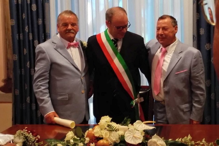 Orlando e Bruno, inossidabile coppia di Pineto, hanno coronato il loro amore, sposandosi in Comune con rito civile. Tutto questo grazie alla recente legge “Cirinnà” sulle unioni civili. In tanti, tra amici e parenti ad assistere alle nozze celebrate con rito civile, in Comune, a Pineto dal sindaco Robert Verrocchio. Visibilmente emozionati, Orlando e Bruno, tanto da sbagliare anche a infilare gli anelli nuziali, hanno potuto ufficializzare la loro unione, dopo 52 anni di vita in comune. Orlando e Bruno sono due paladini dei diritti degli omosessuali e sono stati protagonisti di tante battaglie. Un amore nato in Germania mezzo secolo fa. Abili fioristi, hanno reso riconoscibilissima la loro curata villetta di Pineto, corredata di piante e fiori. Benvoluti dai loro concittadini e un po’ da tutti per il modo affabile e gioviale di porsi, anche se, nella vita, hanno dovuto spesso fare i conti con la discriminazione. Per questo si sono posti come obiettivo quello di difendere il loro amore e i diritti di tutti, affinché siano garantiti a ogni cittadino, come d’altronde sancito nella nostra Costituzione. Ora, con la legge Cirinnà, hanno potuto ufficializzare il loro amore con nozze a pieno titolo col rito civile. Una giornata, quella di ieri, che Bruno e Orlando difficilmente dimenticheranno. Sulla loro Pagina Facebook, le foto, gli auguri e i momenti più belli della giornata di ieri.