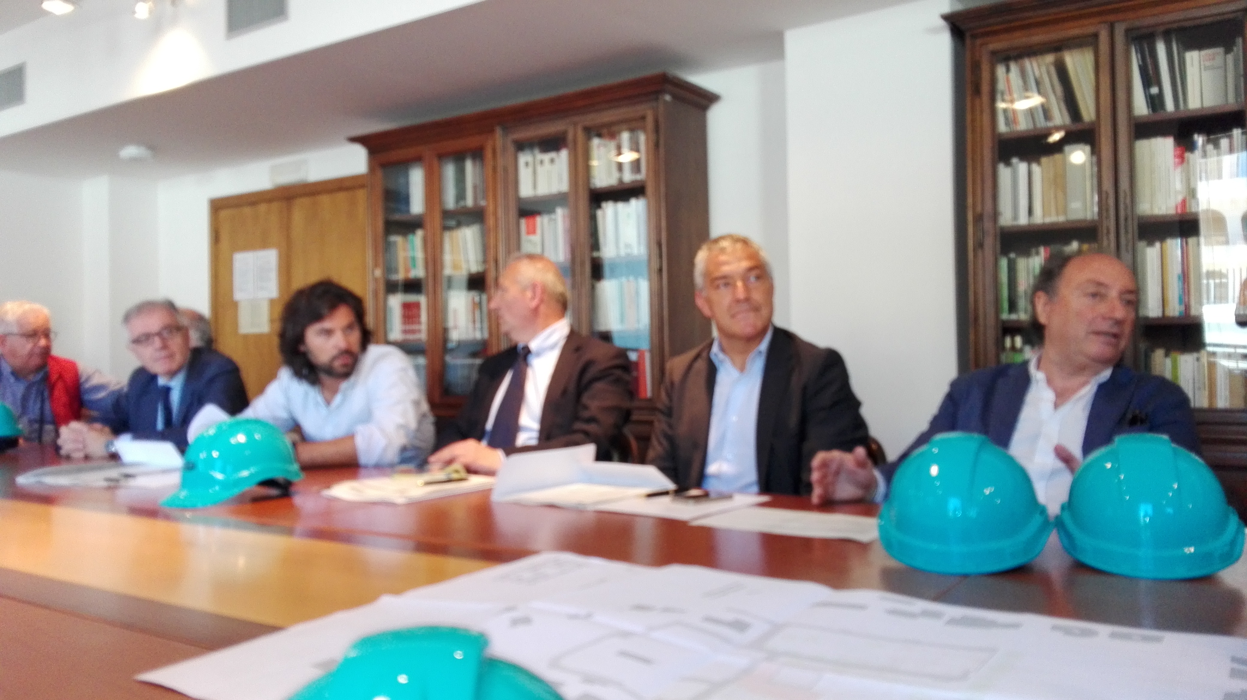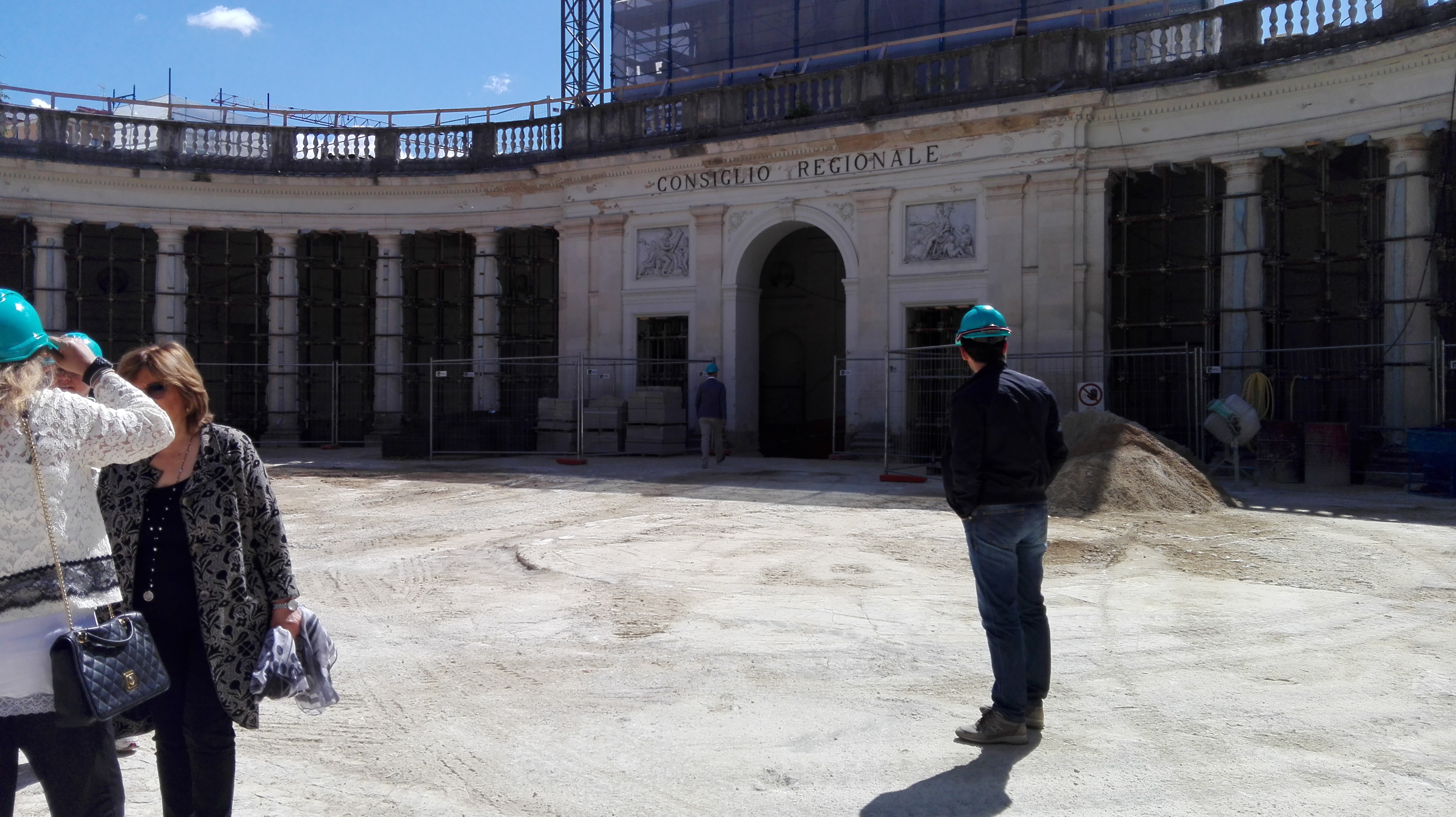 Tutto nei tempi, per un lavoro complesso che cambierà il profilo del palazzo dell’Emiciclo come noi oggi lo conosciamo, e che tornerà a recuperare molto del suo disegno originale: diventerà la conclusione di un grande spazio di piazza che comprenderà anche il centro della villa comunale, com’era all’inizi del 900, un patrimonio di tutta la città. A illustrare questa mattina in un tour con la stampa i progressi del cantiere, oltre al direttore Paolo Costanzi, anche i responsabili della ditta appaltatrice e i progettisti, Riccardo Vetturini, Lucio Zazzara e Giacomo Di Marco.