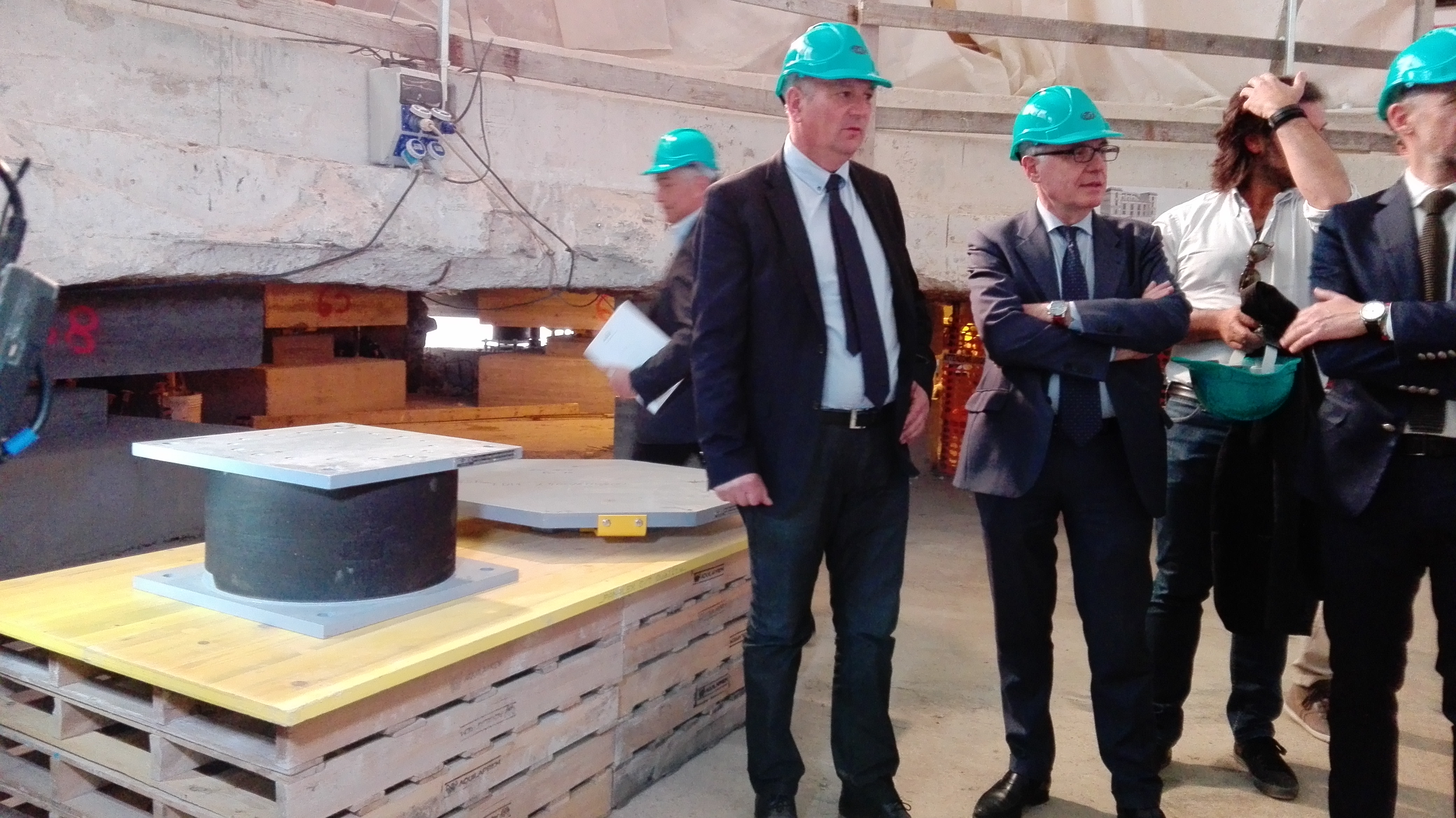 Tutto nei tempi, per un lavoro complesso che cambierà il profilo del palazzo dell’Emiciclo come noi oggi lo conosciamo, e che tornerà a recuperare molto del suo disegno originale: diventerà la conclusione di un grande spazio di piazza che comprenderà anche il centro della villa comunale, com’era all’inizi del 900, un patrimonio di tutta la città. A illustrare questa mattina in un tour con la stampa i progressi del cantiere, oltre al direttore Paolo Costanzi, anche i responsabili della ditta appaltatrice e i progettisti, Riccardo Vetturini, Lucio Zazzara e Giacomo Di Marco.