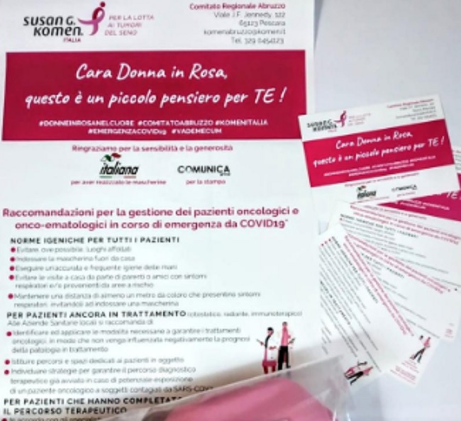 Per questo il Comitato Abruzzo di Komen Italia si è attivato ed ha voluto donare 215 mascherine alle pazienti del Centro Senologico dell’Ospedale Bernabeo di Ortona, realizzate grazie alla generosità dell’azienda “Italiana Sport” di Torre de’ Passeri, insieme ad un Vademecum dei comportamenti da osservare in Emergenza Covid-19 per chi è affetto da una patologia oncologica (per la stampa si ringrazia il Comunica Group).