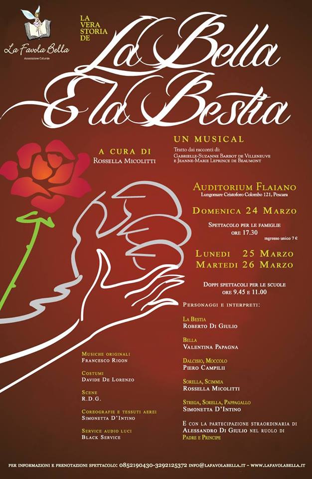 Pescara: domenica, 24 marzo, alle 17.30, all’auditorium Flaiano di Pescara, andrà in scena “La vera storia de La bella e La Bestia” a cura della compagnia La Favola bella.