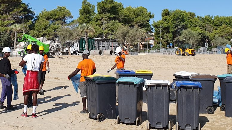 Una ventina di volontari, tutti ragazzi di colore, al lavoro già dalle prime ore di questa mattina per completare la pulizia e rimuovere le ultime bottiglie ed i tappi delle bevande lasciati sull’arenile. Malgrado l’ordinanza di divieto di consumo di alcool centinaia di bottiglie di birra e super alcolici, soprattutto rum, abbandonate sulla spiaggia.