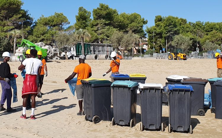 Una ventina di volontari, tutti ragazzi di colore, al lavoro già dalle prime ore di questa mattina per completare la pulizia e rimuovere le ultime bottiglie ed i tappi delle bevande lasciati sull’arenile. Malgrado l’ordinanza di divieto di consumo di alcool centinaia di bottiglie di birra e super alcolici, soprattutto rum, abbandonate sulla spiaggia.