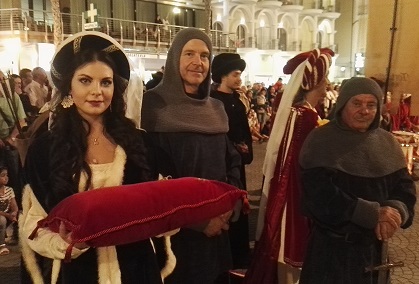 Le vie del centro storico saranno animate fin dal pomeriggio da arti e mestieri di un tempo, poi inizierà il maestoso corteo storico medievale con circa 300 figuranti che indosseranno preziosissimi costumi fedelmente riprodotti da dipinti e immagini dell’epoca. Una serata piena di magia, di fascino, di attrazioni. Tante saranno le delegazioni ospiti provenienti da Marche, Abruzzo e Umbria e artisti provenienti da più parti d’Italia (Friuli, Toscana e Marche) che animeranno le feste a corte. La presentazione della serata sarà affidata al direttore artistico della manifestazione nonché dicitore medievale Fabio Di Cocco. Prima dell’Incendio pirotecnico della Torre che concluderà la serata, ci sarà l’estrazione di una lotteria a premi. La protezione civile di Tortoreto e la Croce Bianca curerà il servizio d’ordine. Sarà messo a disposizione un bus-navetta gratuito dalla rotonda Carducci di Tortoreto lido al centro storico e viceversa, dalle ore 18:00. Per chi vuole salire in auto, ampi parcheggi gestiti sempre dal servizio d’ordine. L’evento storico ripercorre la visita alla Baronìa di Tortoreto da parte del Vicario di Federico II inviato dall’Imperatore e i grandi festeggiamenti indetti per l’occasione dal Barone Roberto di Turturitus, sono i momenti salienti di questi due giorni dedicati alla rievocazione storica. Per il quarto e ultimo anno consecutivo i personaggi del Barone e della Baronessa saranno impersonati da Luigi Ripani e Manuela Romani, lui di Tortoreto e lei di Ascoli; tra l’altro genitori dell’attuale Assessore alla Cultura, Giorgio Ripani; mentre per il secondo anno consecutivo è stata scelta la Gran Dama che custodirà le chiavi della città impersonata dalla tortoretana, Benedetta Felci. Durante la manifestazione sarà aperta al pubblico la Sala dei Drappi dove sono custoditi tutti i 17 drappi-artistici.