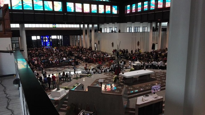 I giovani sono riuniti al santuario in provincia di Teramo di Isola del Gran Sasso per una veglia mariana internazionale in preparazione alla prossima assemblea del Sinodo dei vescovi, in collegamento video con le diocesi di Panama City (Panama), Novosibirsk (Federazione Russa), Waterford (Irlanda), Tainan City (Taiwan).