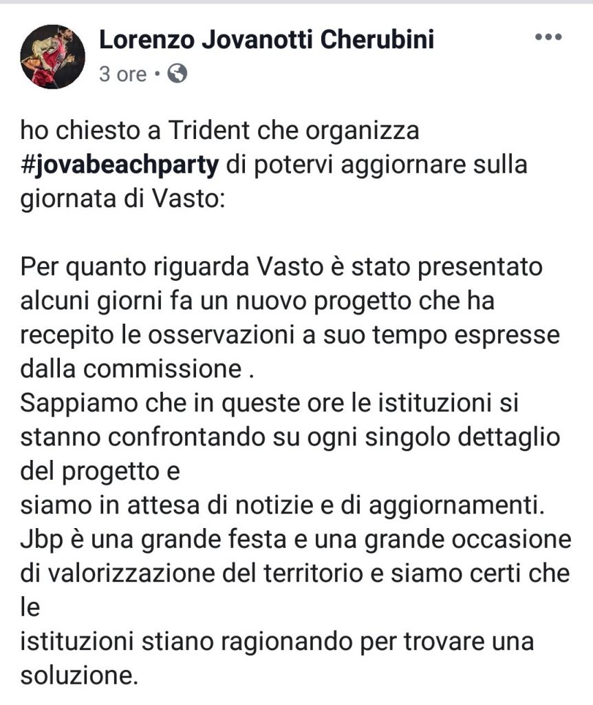“Siamo ancora in corsa per il Jova beach party del 17/8”: lo ha detto il sindaco di Vasto al termine della conferenza stampa odierna. Intanto su Facebook il post ottimista di Jovanotti.
