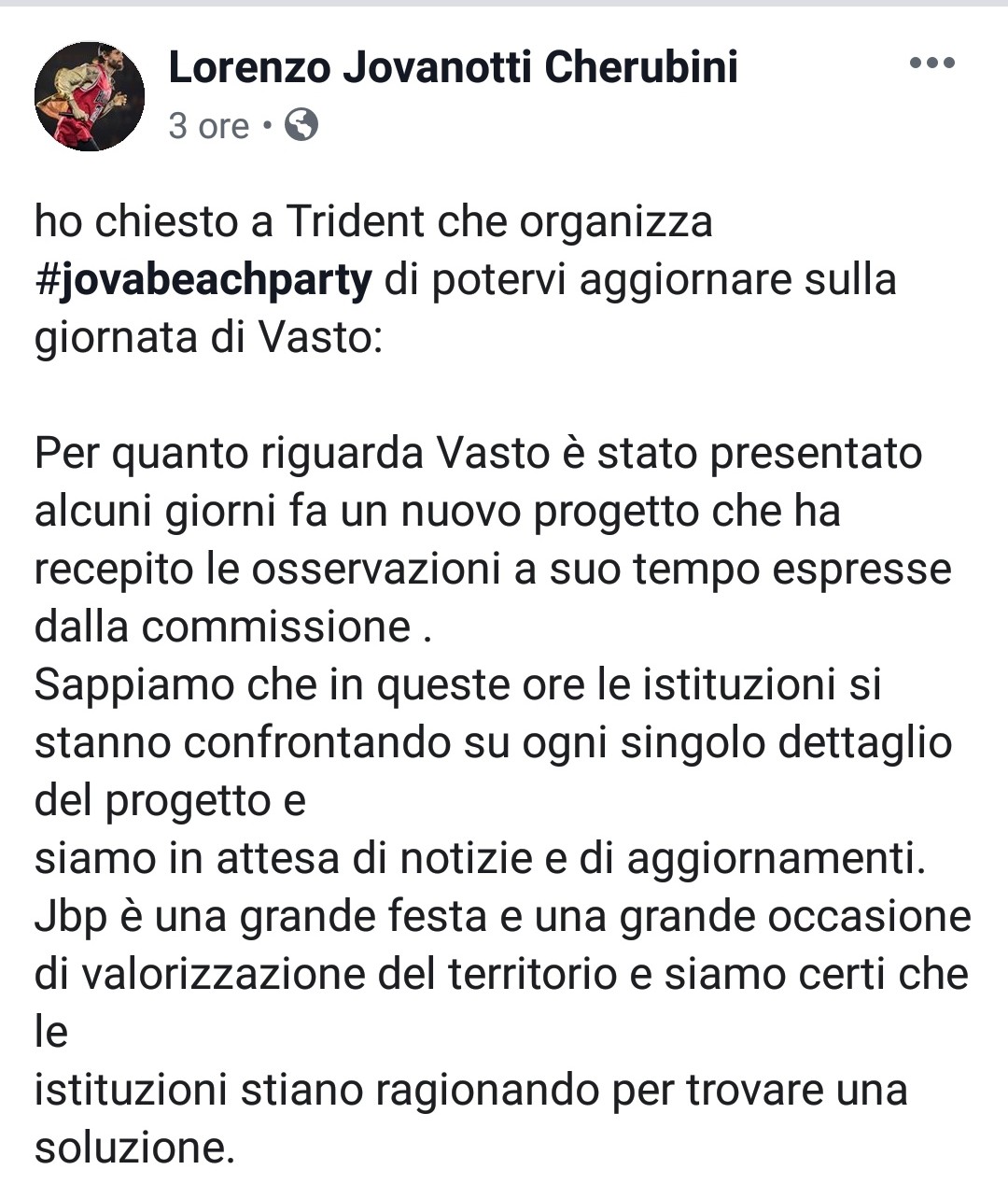 Il post di Jovanotti sulla sua Pagina Facebook