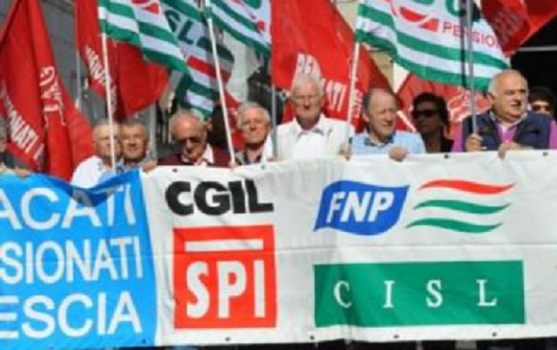 La protesta dei sindacati dei pensionati Spi-Cgil, Fnp-Cisl e Uilp-Uil per la manovra finanziaria del governo, che ha bloccato la rivalutazione degli assegni superiori ai 1.500 euro lordi mensili (circa 1200 euro netti), non si ferma.