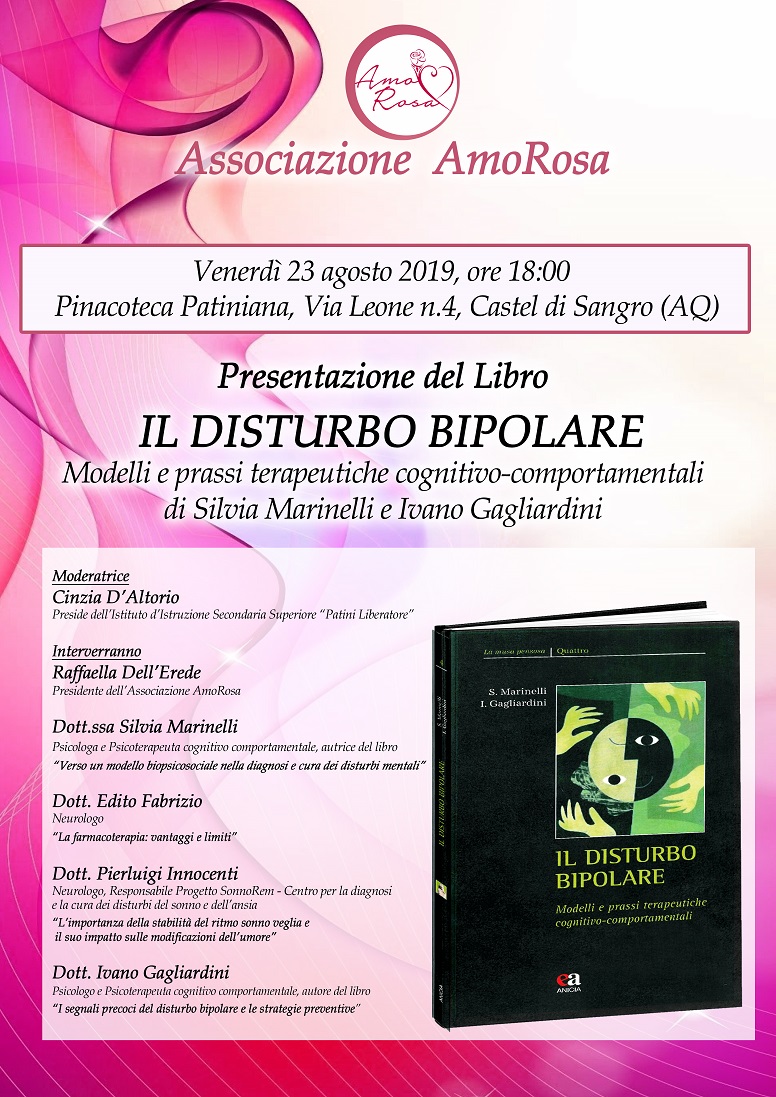 La presentazione del libro sarà l’occasione per analizzare la tematica del disturbo bipolare insieme agli autori del libro, Silvia Marinelli e Ivano Gagliardini, e a Edito Fabrizio, neurologo, e Pierluigi Innocenti, neurologo e responsabile del progetto SonnoRem – centro per la diagnosi e la cura dei disturbi del sonno e dell’ansia. Il dibattito sarà moderato da Cinzia D’Altorio, dirigente scolastica dell’Istituto di istruzione secondaria superiore “Patini Liberatore” di Castel di Sangro. L’evento sarà presenziato dalla presidente dell’associazione AmoRosa, Raffaella Dell’Erede.
