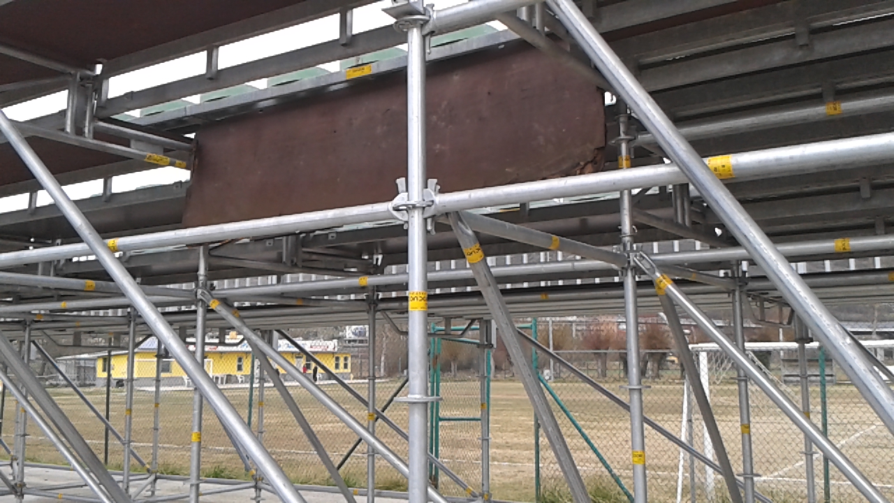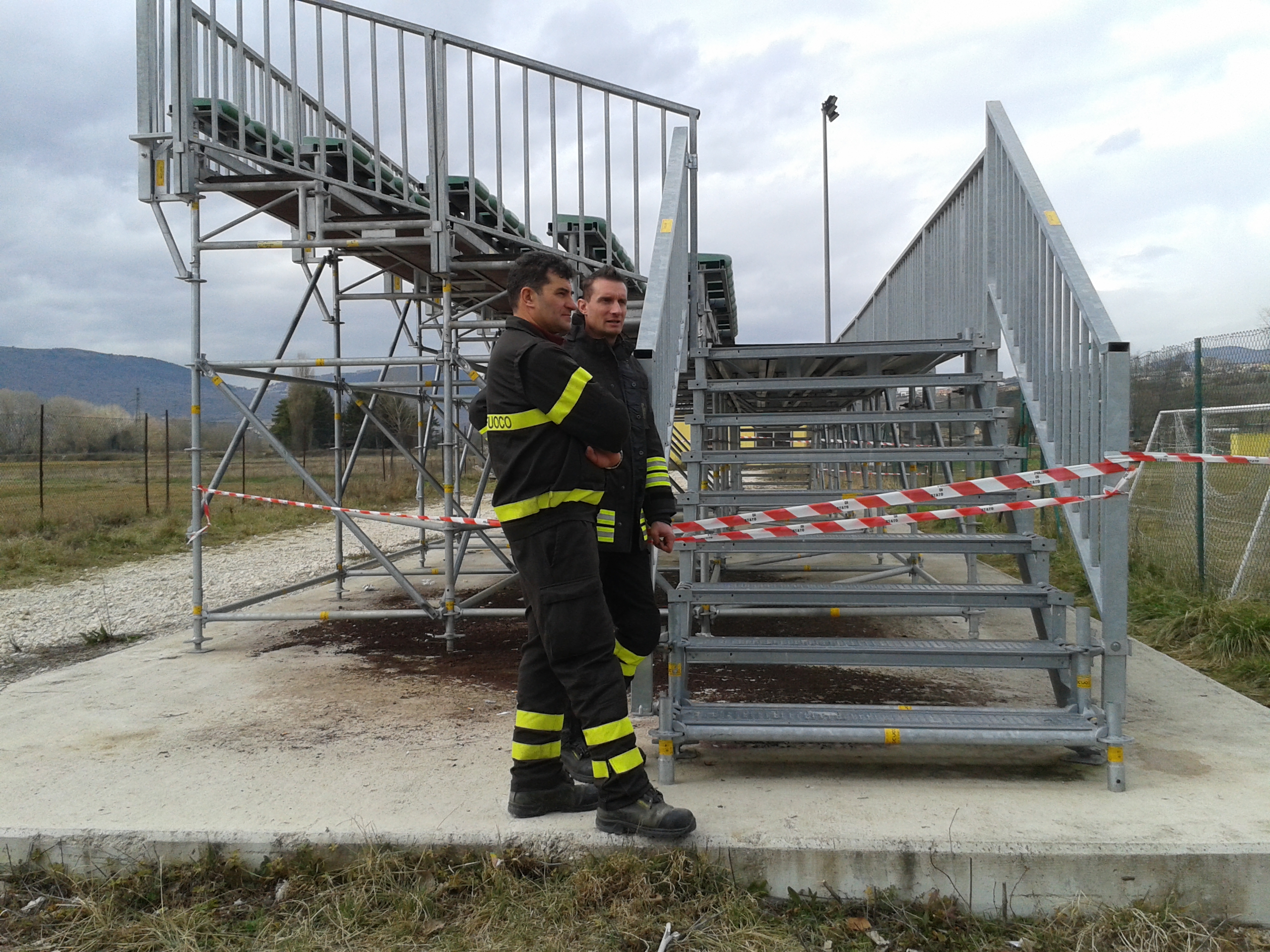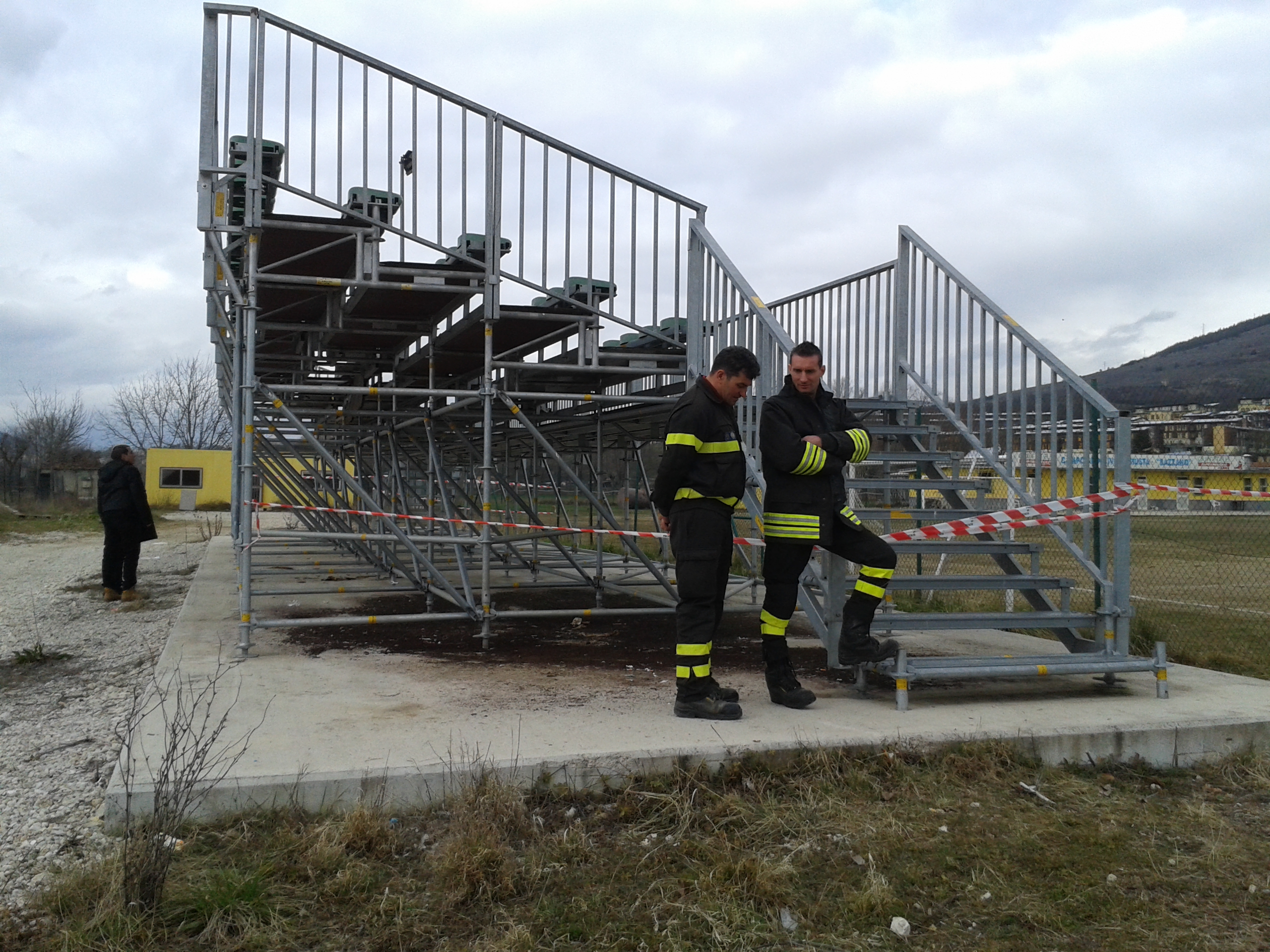E’ accaduto a Bazzano, frazione dell’Aquila, al 91′ del derby L’Aquila-Pescara. Mentre il pubblico defluiva dall’impianto ha ceduto un tavolato di legno che fa da passerella sulla struttura metallica di cosiddetti “tubi Innocenti”.