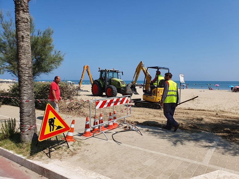 Uomini e mezzi del Comune sono al lavoro giorno e notte per effettuare il ripascimento dell’arenile che dovrà essere ampliato di 15 metri circa nel tratto di spiaggia libera tra gli stabilimenti Sabbia d’oro e Bagni Bruno. La rimozione delle siepi e dei cordoli della pista ciclabile servirà a creare una quindicina di vie di esodo per favorire il deflusso senza ostacoli dei partecipanti a fine concerto.