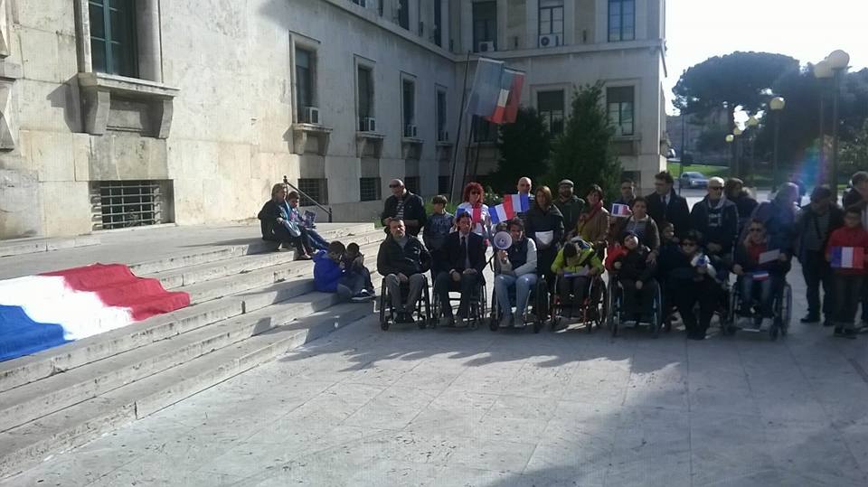 A Pescara, bandiera a mezz’asta in Comune e in giornata due le manifestazioni: quella organizzata da Carrozzine Determinate” (foto sopra) davanti alla Prefettura, e quella in piazza Salotto con l’adesioni di diverse associazioni, studenti e partiti. Mentre tra qualche giorno scenderà in piazza anche la comunità musulmana che condanna con sdegno gli attentati.