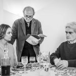 - Uno scatto del set del corto: gli attori Morena Gentile e Caludio Bigagli (seduti al tavolo) ricevono indicazioni dal regista Giancarlo Scarchilli (in piedi tra i due protagonisti).
