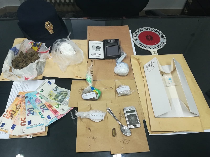 Scattata la perquisizione, sono stati rinvenuti nella cucina complessivamente 78 grammi di cocaina, 35 di eroina, 30 di marijuana, tutta sostanza suddivisa in dosi. Sono stati altresì rinvenuti e sequestrati un bilancino di precisione, un proiettile calibro 7,65 e 305 euro, probabile provento dell’attività di spaccio. Nella stessa stanza in cui era conservata la sostanza stupefacente vi erano 4 figli minorenni di 4, 10, 13 e 17 anni. Le ricerche di ulteriori elementi sono state estese all’area limitrofa l’appartamento con l’ausilio della Squadra Cinofili della Questura, consentendo di rinvenire e sequestrare un involucro contenente ulteriori 38 grammi di cocaina nonché un altro bilancino di precisione, occultati dentro una cassetta della posta, contornati da polvere di caffè. La donna, pertanto, è stata tratta in arresto in flagranza di reato per detenzione ai fini di spaccio di sostanza stupefacente e messa a disposizione dell’Autorità Giudiziaria. In mattinata odierna verrà sottoposta al giudizio direttissimo.