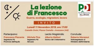 L’appuntamento è per lunedì 11 novembre 2019 alle ore 17 al Castello Orsini in piazza Castello ad Avezzano. Il dibattito, che affronterà tematiche importanti come guerra, ecologia, migrazioni e lavoro, sarà animato da: Francesco Piacente, segretario Pd della Provincia dell’Aquila; Michele Fina, segretario regionale del Pd Abruzzo; Alberto Melloni, storico del Cristianesimo, e Roberto Morassut, sottosegretario al Ministero dell’ambiente.