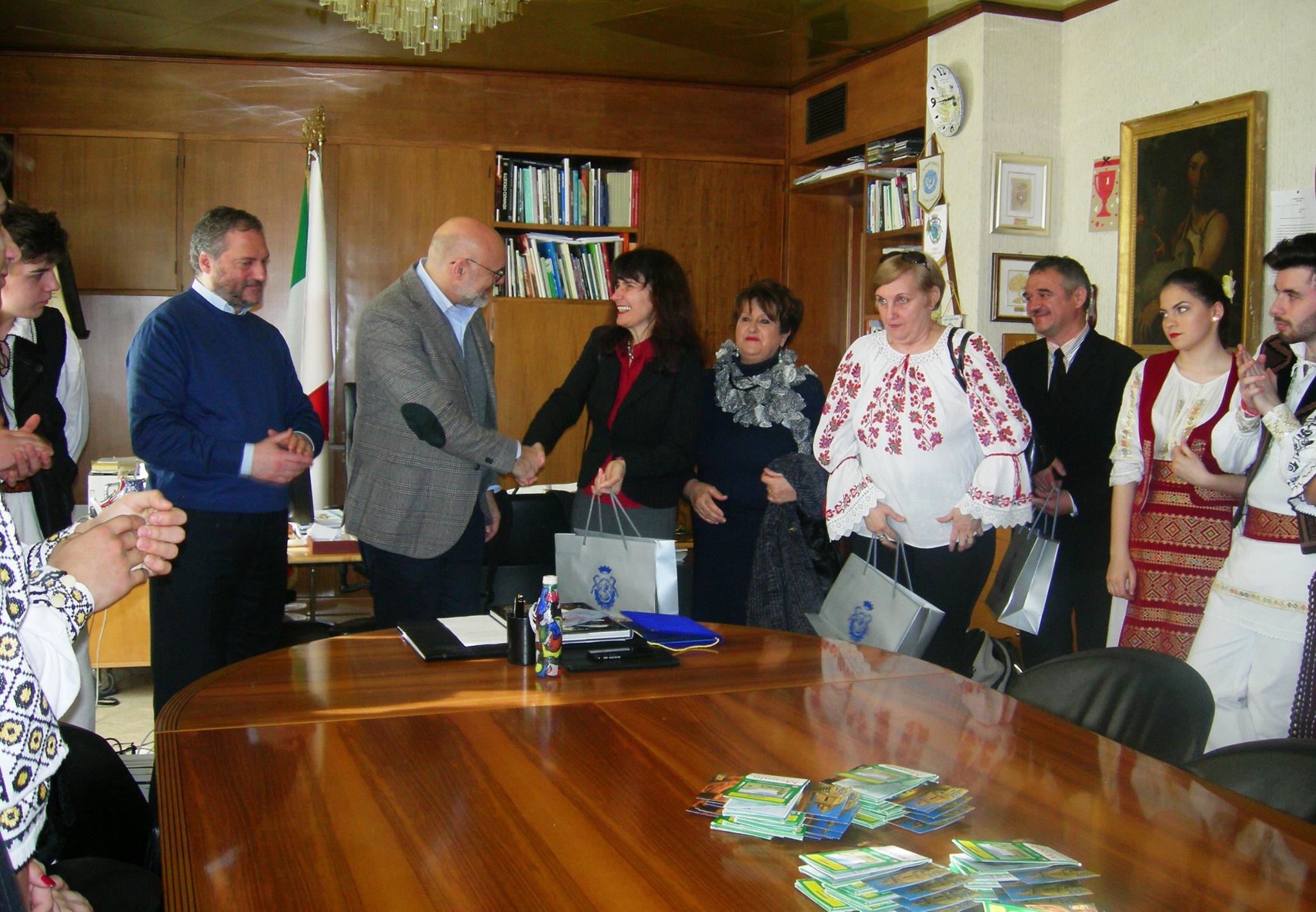 Il Sindaco di Chieti, Umberto Di Primio, e il Vicesindaco Giuseppe Giampietro, questa mattina, presso la sede del Municipio, hanno dato il benvenuto in città ai rappresentanti delle associazioni “Casa Oraseneasca de Cultura Romania” e “Scoala Populare de Arte si Miserii Jon Romino”, provenienti dalla Romania, con le quali l’Associazione “Camminando Insieme” di Chieti ha instaurato rapporti e scambi culturali già dall’ottobre 2016 in occasione del convegno “Decision making in economic and social sciences between tradition and innovation” tenutosi in Romania nella città di Resita e promosso dall’Università “G. d’Annunzio” in collaborazione con l’Università di Resita.