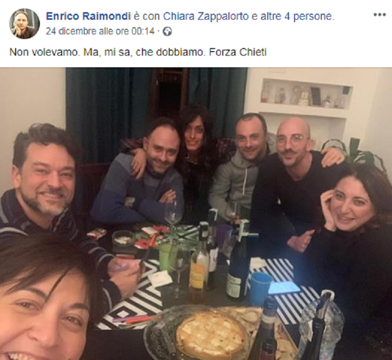 “Non volevamo. Ma, mi sa, che dobbiamo. Forza Chieti”. È la didascalia che si legge a corredo della foto postata sul profilo Facebook di Enrico Raimondi, consigliere di Chieti. Da capo del Comune teatino. Con lui i consiglieri di opposizione all’attuale giunta Di Primio, evidentemente pronti a scaldare i motori per l’imminente campagna elettorale che a maggio riguarderà anche la città di Chieti.