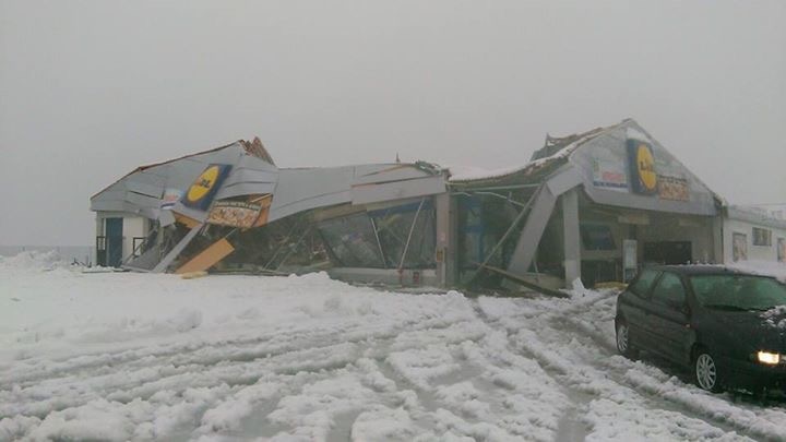 La copertura in lamiera del Supermercato Lidl di Campetto di Penne è crollata sotto il peso della neve. Probabilmente a determinare il cedimento della copertura anche le scosse di terremoto di quest’oggi.