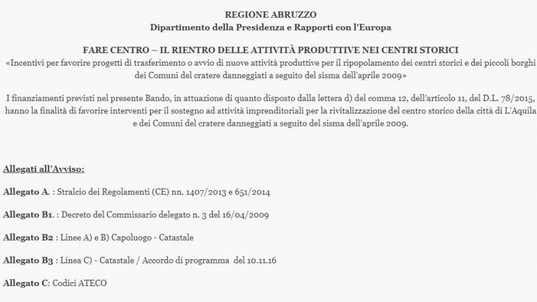 Un bando che ha l’obiettivo di ripopolare i centri storici dell’Aquila e dei Comuni colpiti dal terremoto del 2009. Decine di titolari di imprese, attività commerciali e partite Iva aspettano però da mesi il saldo dei fondi, tempi lunghi che vanno dai 4 ai 6 mesi per l’erogazione dei finanziamenti, una lentezza che mette in difficoltà le piccole imprese che hanno investito somme importanti confidando, appunto, nei finanziamenti regionali (provenienti dal famoso plafond del 4% dei fondi della ricostruzione destinati allo sviluppo economico del cratere sismico). Alla fine di giugno risultano effettuati pagamenti per saldi da 4 milioni circa di euro insieme ad anticipazioni e acconti per altri 2 milioni di euro; dunque sul totale della linea di finanziamento di circa 20 milioni di euro al momento sono stati spesi soltanto 6 milioni.