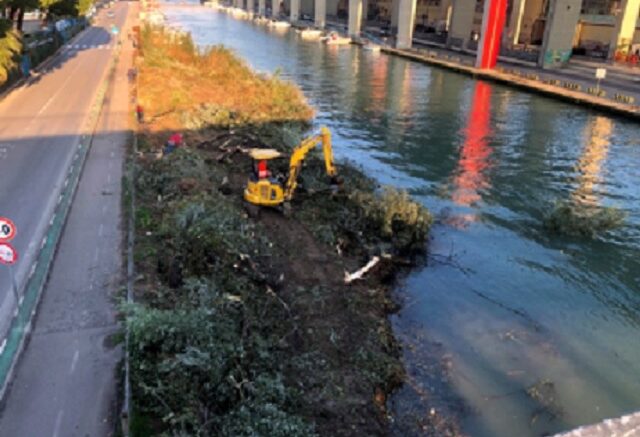 Che ne sarà ora di questo lembo di argine, di terreno non più imbrigliato tra le radici degli alberi? Verrà rimosso anch’esso per dare unicità percettiva al corso d’acqua, come da qui fino al mare, ovvero solo di canale navigabile e neanche un briciolo di parvenza di entità funzionale ecosistemica?