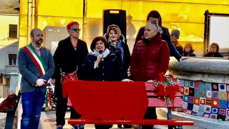 Tante persone in piazza Umberto I°, nel cuore di Corfinio, per “la panchina rossa 1522”, la campagna delle democratiche della provincia dell’Aquila contro le violenze di genere e i femminicidi.