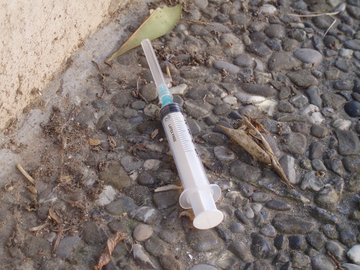 Siringhe nel contenitore per la raccolta degli abiti usati posizionato al centro dell’Aquila, in via della Genca.