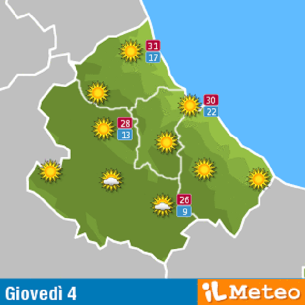 Nel Teramano: sereno, temperature tra i 17 °C e i 29 °C.