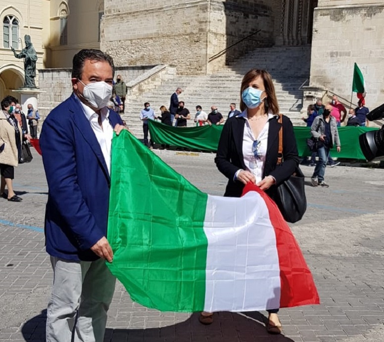 Intonando l’Inno di Mameli a Chieti, nella centralissima piazza San Giustino, consiglieri regionali, comunali, sindaci e simpatizzanti di Lega, FdI e centrodestra si sono ritrovati con tanto di mascherine per dire che “L’Italia non si arrende” e che l’orgoglio italiano è pronto a ribellarsi all’inefficacia delle misure adottate dal Governo, giudicate inutili per ricostruire il tessuto economico e sociale dell’Italia.