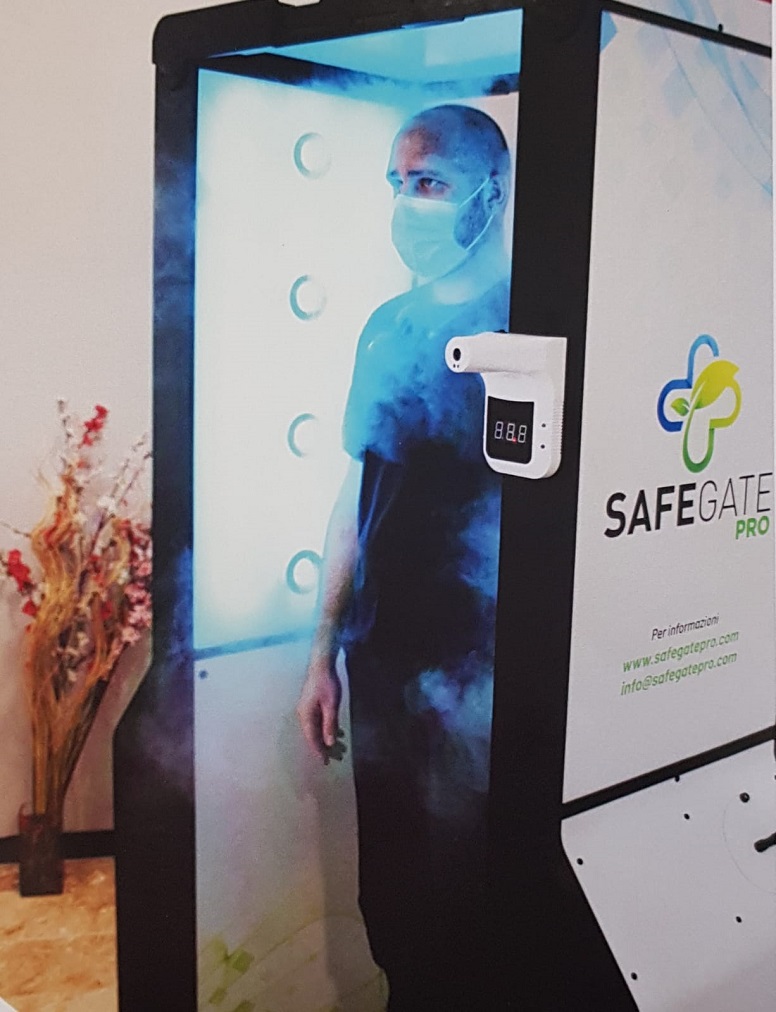 “L’obiettivo del Safe gate è ripartire in sicurezza”, dichiara Fernando Antonangeli, responsabile commerciale della Safe gate pro. “All’indomani dell’emergenza e in vista della riapertura della nostra azienda, abbiamo contattato un chimico e un ingegnere per capire se era possibile trovare una soluzione al problema della sanificazione costante di ambienti e persone. Così è nata Safe gate pro, una porta in sicurezza dove cose e persone potevano beneficiare di un’igienizza costante e contemporanea. La tecnologia dell’umidificazione a ultrasuoni, ci consente di nebulizzare una soluzione idroalcolica con acqua osmotizzata, l’1% di acido lattico e l’1% di perossido di idrogeno, la comune acqua ossigenata, presente nel liquido nebulizzato in una quantità che è cinque volte al di sotto della soglia consentita dalla legge e che può quindi essere respirato dalle persone perché è completamente innocuo. Così abbiamo raggiunto uno standard che ci consente di sanificare i luoghi senza far uscire le persone e poi arieggiare le stanze, ma rimanendoci dentro e igienizzandoci noi stessi attraverso una continua e costante sanificazione di persone e ambienti.”