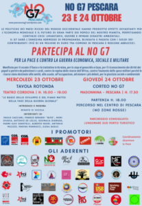 Giovedì 24 ottobre sarà invece la volta del corteo No G7. L’appuntamento per i partecipanti è previsto alle 17,30 alla Madonnina di Pescara con partenza alle 18. Il corteo sfilerà per le vie del centro di Pescara, senza interferire con le strade delle zone rosse.