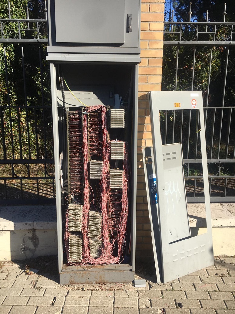 A Pescara in via Romualdo Pantini alcuni vandali hanno divelto lo sportello di una cabina della Telecom, lasciando i fili telefonici e della fibra ottica scoperti.