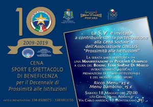 Sabato 18 maggio 2019 alle ore 20, presso il Grand Hotel di Montesilvano, la onlus Prossimità alle istituzioni festeggerà il suo decennale con una cena sociale corredata di musica e sport. Nell’ambito della serata si terrà infatti la manifestazione di pugilato olimpico a cura del boxing team di Simone Di Marco.