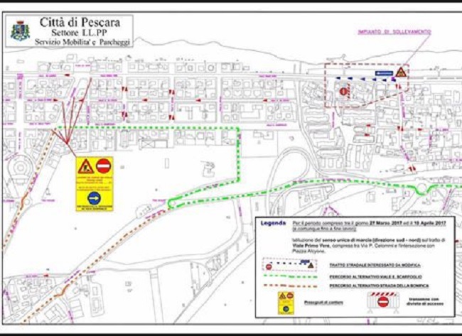 Il vice sindaco Enzo Del Vecchio sui lavori che andranno avanti per due settimana: “Il senso unico si è reso necessario per porre un tubo di collegamento con la vasca di raccolta delle acque. Chi viene da nord girerà a via Luisa d’Annunzio. Da oggi e per due settimane il tratto di riviera di Pescara Porta Nuova che va da via Celommi a Piazza Alcyone sarà a senso unico direzione sud-nord. Una necessità richiesta dai lavori anti allagamento in corso nella zona, che consentirà di posizionare il tubo di collegamento alla vasca di raccolta, in via di realizzazione. Si tratta di un tubo che corre quasi al centro della carreggiata, per tale ragione è necessario limitare il transito durante i lavori di installazione, che richiederanno due distinte squadre di operai, una all’opera sulla vasca, l’altra alle prese con il collegamento della rete. Al fine di smaltire il traffico rivierasco che da nord procede verso Francavilla, è stata inoltre predisposta la deviazione obbligatoria su via Luisa d’Annunzio, in modo che le auto possano procedere lungo via Scarfoglio e proseguire su via Silone e da lì immettersi sulla statale per poter proseguire verso sud e bypassare così il cantiere. Per rendere più evidenti tali disposizioni, oltre alla cartellonistica, lunedì sia la zona di deviazione che il tratto di lungomare interessato saranno presidiati dalla Polizia Municipale”.