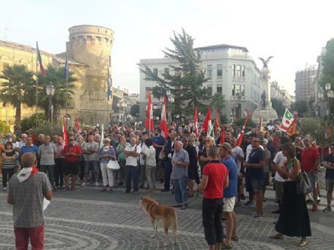 Piazza Rossetti con le bandiere rosse al vento e il canto di ‘Bella Ciao’, è questa la risposta “antifascista e antirazzista” della manifestazione organizzata dal comitato spontaneo su impulso dell’Anpi (Associazione nazionale partigiani d’Italia) alla quale hanno aderito le forze politiche e sindacali del territorio e una parte della società civile quale risposta a due episodi accaduti la scorsa settimana a Vasto e che ha minato la serenità democratica. A ricordarlo spiegando le motivazioni dell’autoconvocazione – nella piazza che l’Amministrazione comunale di Vasto da anni ha voluto dedicare ad alcuni cittadini del Vastese che hanno caratterizzato con la loro vita l’impegno antifascista nel secolo scorso – il presidente della sezione di Vasto dell’Anpi, Mimmo Cavacini.