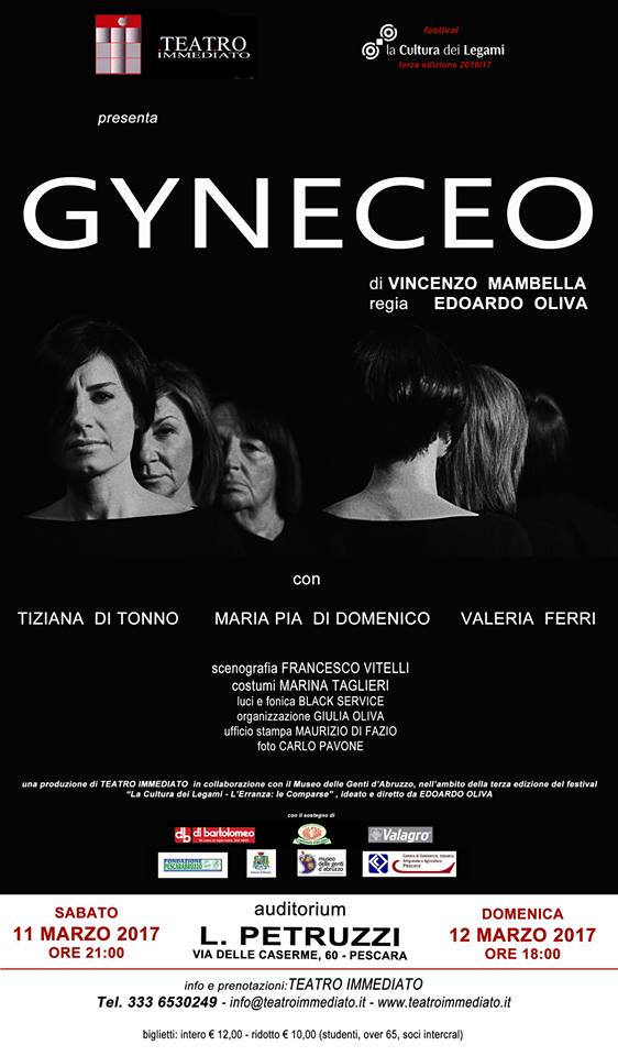 Gyneceo, di Vincenzo Mambella, è in scena all’auditorium Petruzzi di Pescara stasera, sabato 11 marzo, e domani, domenica 12 marzo, nel pomeriggio. Protagoniste sul palcoscenico le attrici Tiziana Di Tonno, Maria Pia Di Domenico e Valeria Ferri. Scene di Francesco Vitelli. “L’erranza” narra di vite anonime e di quotidianità senza gesti eroici, di esistenze marginali che vivono le proprie ordinarie tragedie lontano dai riflettori. Gyneceo è la seconda tappa della trilogia sull’erranza” iniziata con un altro spettacolo diretto da Edoardo Oliva: Caprò.