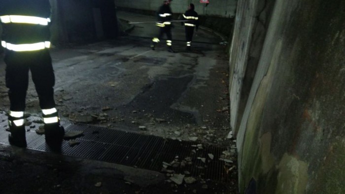 Improvviso distacco di calcinacci ieri sera a Sambuceto, nel sottopasso ferroviario tra via Mazzini e via Aldo Moro. Strada chiusa almeno fino a martedì.