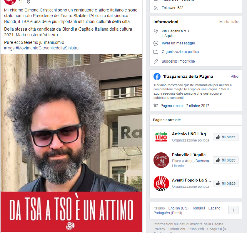 “Mi chiamo Simone Cristicchi sono un cantautore e attore italiano e sono stato nominato Presidente del Teatro Stabile d’Abruzzo dal sindaco Biondi, il TSA è una delle più importanti istituzioni culturali della città. Della stessa città candidata da Biondi a Capitale Italiana della cultura 2021. Ma io sosterrò Volterra. Pure ecco tenemo ju manicomio”.