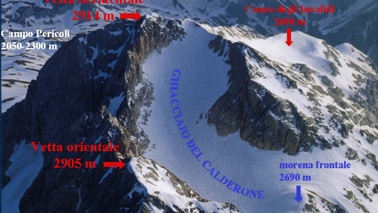 E’ l’effetto dei cambiamenti climatici che avvengono a livello globale. Ma il più grande ghiacciaio meridionale d’Europa, il Calderone, gode ancora di un buono stato di conservazione nella sua parte cosiddetta “fossile”, al di sotto dei detriti rocciosi, e misura tra i 15 e i 25 metri.
