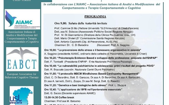 Il Centro di Psicologia Clinica diretto dal Dottor Carlo Di Berardino in collaborazione con l’AIAMC, “Associazione italiana di analisi e modificazione del comportamento”, organizza il prossimo venerdì 11 alle ore 9,00 presso la sala CE. SI. dell’Università d’Annunzio di Chieti, il convegno sul tema “Prevenzione e medicina comportamentale”.