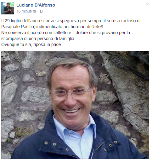 Eppure sappiamo, retorica insegna, la morte far parte della vita e viceversa. Non è come si muore, ma come si vive a fare la differenza. E tu, la differenza, l’hai fatta fino all’ultimo: hai vissuto. Caro Diretto’ è che ci mancano le tue dirette fiume: noi inermi di fronte al tuo stare ore e ore instancabilmente davanti alle telecamere, ci manca il tuo immediato sederti in studio senza la benché minima scaletta, se non qualche agenzia, perché tu stavi sempre sul pezzo e volevi che anche i nostri telespettatori lo fossero. Sai in quanti ci fermano ancora e ci parlano di te, di quel modo di porsi sornione e genuino ma anche puntuale e lungimirante? Tu sapevi già cosa, in fondo, i nostri telespettatori volevano sapere. Sempre sul pezzo, nell’immediatezza di eventi da raccontare che nel bene e nel male hanno toccato o intaccato l’Abruzzo. Ti bastava un microfono e una telecamera e quei telefoni aperti che avvicinavano gli Abruzzesi alla TV degli e fatta dagli Abruzzesi. Pioniere dell’emittenza televisiva privata in Abruzzo, cronista, anchorman, conduttore, cantante, animatore, Pasquale Pacilio era e resta l’eclettico protagonista di una TV della e per la gente.