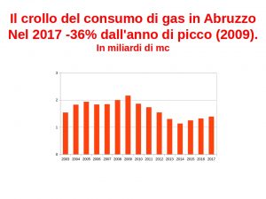 “Per l’Abruzzo i dati del 2018 non sono stati ancora pubblicati e gli ultimi disponibili, del 2017, indicavano un -36% rispetto all’anno di picco, il 2009. Si tratta dell’ennesima dimostrazione che la rete infrastrutturale italiana e abruzzese è già ora sovradimensionata, come d’altro lato rilevato a giugno 2018 da MedReg, il consorzio delle authority del settore dei paesi del Mediterraneo. L’Abruzzo è al centro di numerosi interventi tra nuove infrastrutture interregionali e ampliamenti dell’esistente, a servizio del progetto di trasformare l’Italia in un “Hub del Gas”: nuova centrale di compressione di Sulmona; gasdotto Sulmona-Foligno; gasdotto Larino-Chieti; ampliamento gasdotto San Salvo-Biccari; nuovo stoccaggio San Martino sulla Marrucina;