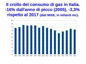 “Per l’Abruzzo i dati del 2018 non sono stati ancora pubblicati e gli ultimi disponibili, del 2017, indicavano un -36% rispetto all’anno di picco, il 2009. Si tratta dell’ennesima dimostrazione che la rete infrastrutturale italiana e abruzzese è già ora sovradimensionata, come d’altro lato rilevato a giugno 2018 da MedReg, il consorzio delle authority del settore dei paesi del Mediterraneo. L’Abruzzo è al centro di numerosi interventi tra nuove infrastrutture interregionali e ampliamenti dell’esistente, a servizio del progetto di trasformare l’Italia in un “Hub del Gas”: nuova centrale di compressione di Sulmona; gasdotto Sulmona-Foligno; gasdotto Larino-Chieti; ampliamento gasdotto San Salvo-Biccari; nuovo stoccaggio San Martino sulla Marrucina;