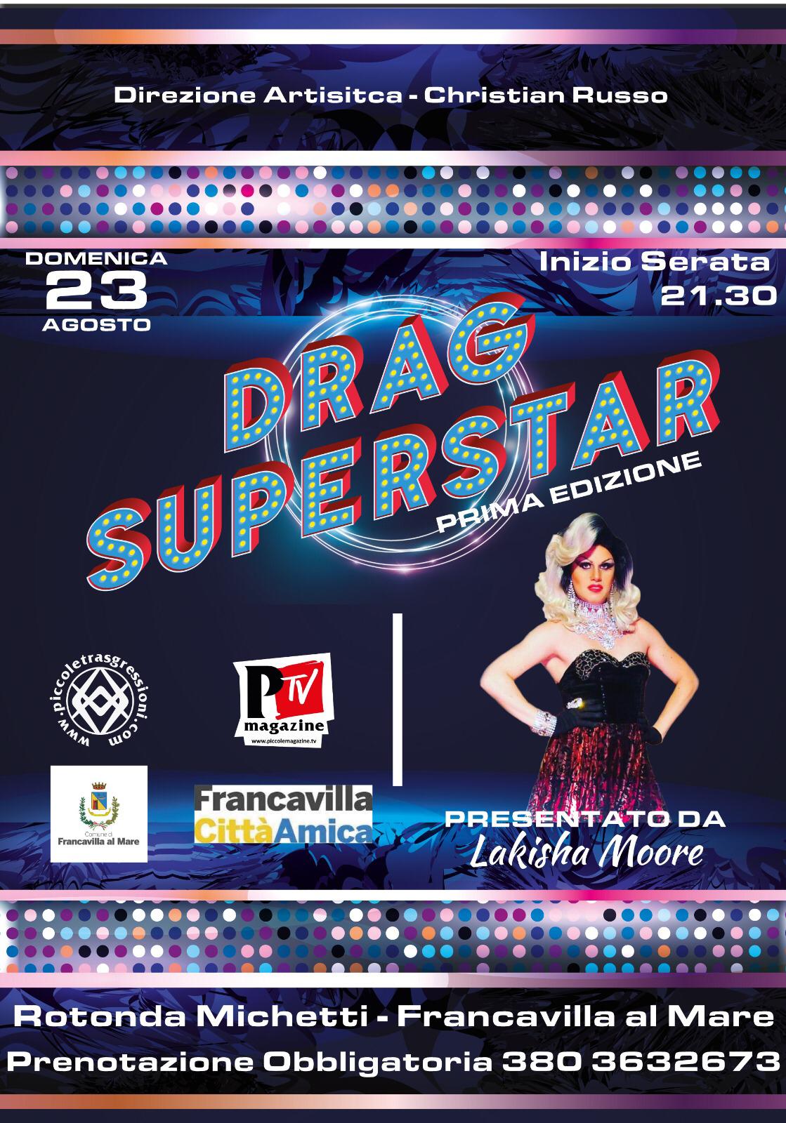 Domenica 23 agosto, a Francavilla al Mare, in piazza Rotonda Michetti, dalle ore 21.30 arriva la prima edizione di Drag Superstar, concorso – spettacolo dedicato all’arte della drag queen.
