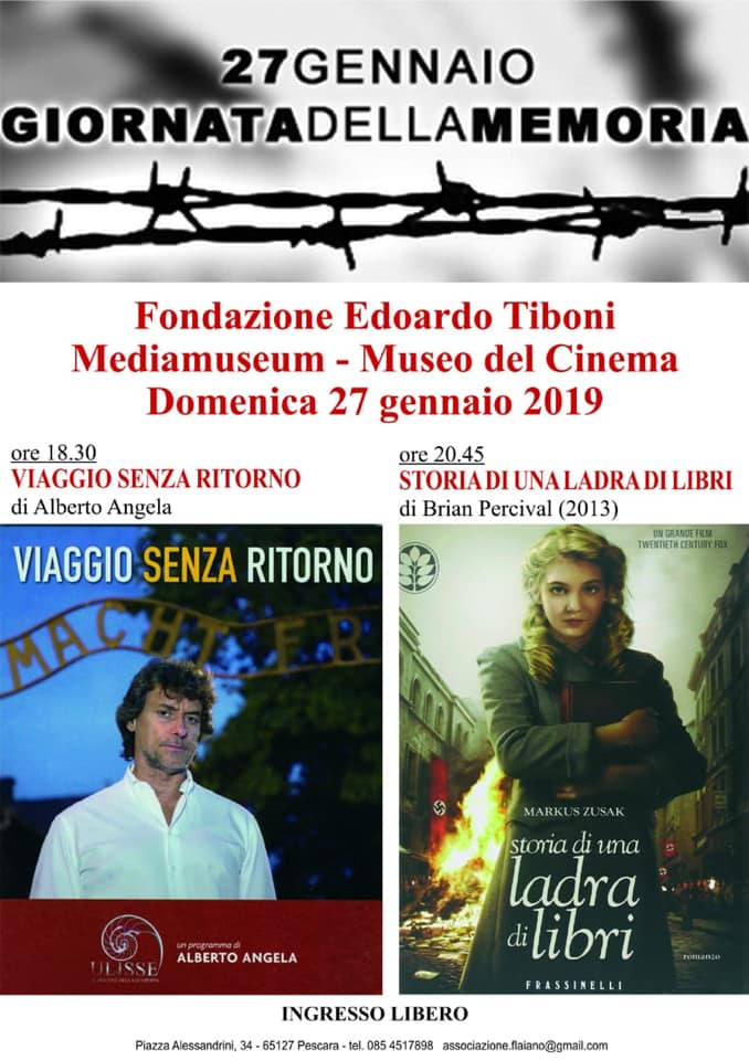 Nella Giornata della Memoria, nata per commemorare le vittime dell’Olocausto, domenica 27 gennaio la Fondazione Edoardo Tiboni e l’Associazione culturale Ennio Flaiano organizzano un evento speciale con due proiezioni dedicate: alle 18.30 il docufilm di Alberto Angela “Viaggio senza ritorno” e alle 20.45 il film “Storia di una ladra di libri”, di Brian Percival e con Emily Watson. L’ingresso è gratuito.