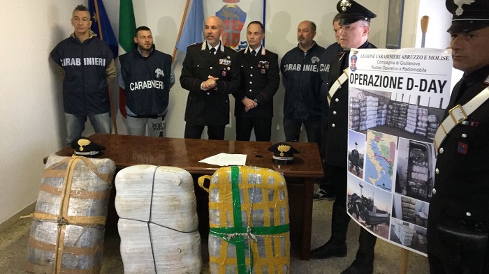 I Carabinieri di Giulianova, dopo giorni di estenuante osservazione, hanno sequestrato 2 tonnellate di marijuana purissima, trovata in un deposito nelle campagne di Fossacesia. Un sequestro record, con lo stupefacente che, se immesso sul mercato, avrebbe fruttato al dettaglio quasi 10 milioni di euro. I militari dell’Arma, diretti dal capitano Domenico Calore, hanno arrestato un 49 enne pugliese, già noto per fatti di giustizia, Giovanni Carabotti. Dopo ore di attesta, l’uomo, caduto nella trappola e vistosi scoperto, si è dato alla fuga a bordo della sua auto, dando vita a un rocambolesco inseguimento, che si è concluso al casello autostradale di Val di Sangro, dove il 49 enne è stato bloccato e arrestato. E’ stato sequestrato, inoltre, un gommone di 10 metri, utilizzato per il trasporto della droga. L’uomo è ora rinchiuso nel carcere di Lanciano a disposizione dell’Autorità Giudiziaria.